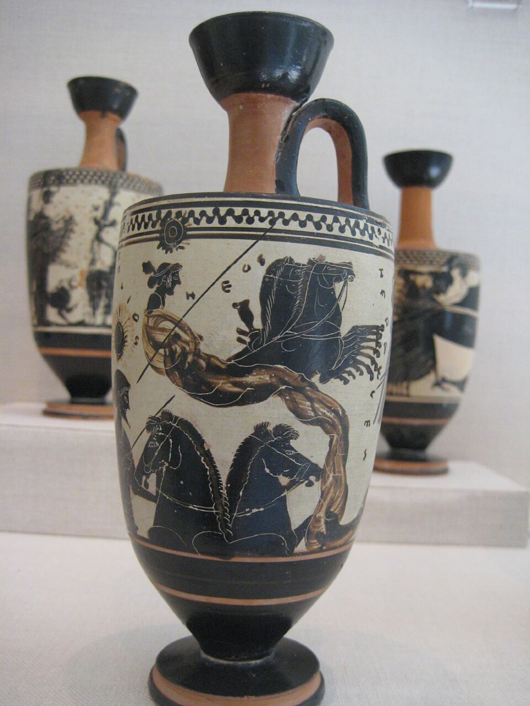 Helios y la Noche. Lecito de figuras negras del siglo IV a. C. Representa a Helios, ascendiendo en su cuadriga, la Noche, alejándose hacia la izquierda y Eos a la derecha.