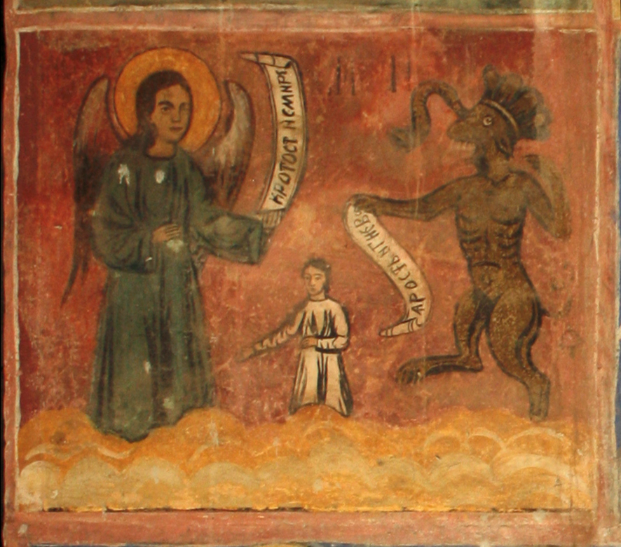 Tradicionalmente, las únicas acciones que son de libre voluntad son consideradas merecedoras de crédito o culpa. (Ángel con las virtudes Temperancia y Humildad contra Demonio con los pecados Ira y Odio. Fresco de 1717, Iglesia de San Nicolás, Cukovets, provincia Pernik, Bulgaria). El albedrío (de la deformación vulgar del vocablo latino arbitrium, a su vez de arbiter, ‘juez’), libre albedrío o libre elección es la creencia de aquellas doctrinas filosóficas según la cual las personas tienen el poder de elegir y tomar sus propias decisiones. Muchas autoridades religiosas han apoyado esta creencia, mientras que ha sido criticada como una forma de ideología individualista por pensadores como Baruch Spinoza, Arthur Schopenhauer, Karl Marx y Friedrich Nietzsche. Últimamente científicos del cerebro están cuestionando el libre albedrío.